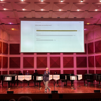 Dean Johnston Turner gave a brief overview of each piano—the origin, how the instruments were crafted, where the wood was sourced, etc.—and then the audience heard piano performance students and piano faculty play each instrument and speak about what they were hearing and feeling. Terms like, “action,” “timbre,” “dynamic contrast,” “consistency across ranges,” “bright and dark,” and “warmth,” were discussed and heard, and audience members learned about and heard the subtle differences between each instrument. They even voted on their favourite.