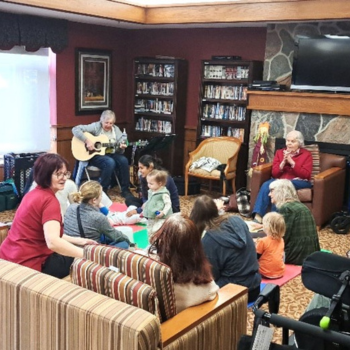 It is a quiet weekday morning in a long-term care facility and several residents sleep in their wheelchairs in a common area while a radio or TV plays quietly in the background. An individual with a guitar and ukulele enters the room and begins to play and sing songs that would be familiar to the individuals sitting nearby. Those sleeping begin to wake up. Those staring out a window or at a TV begin to turn their heads and begin to engage musically with the individual playing the live music. After a few minutes of singing familiar songs together, the common area begins filling up with a parade of babies and toddlers. Some are walking, holding their caregiver’s hand and others are in infant carriers and strollers. The music shifts to an upbeat “hello” song, and the faces of both the long-term care residents and children beam as they greet one another with a musical hello.